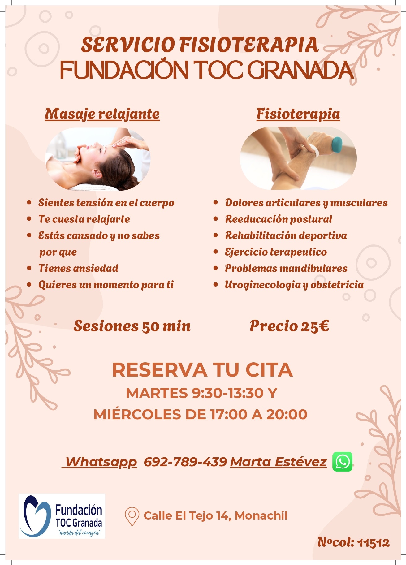 Marta Estévez Loro se hará cargo del servicio de fisioterapia y masajes en el Club Social «Mirador de Granada» de la Fundación TOC Granada. Os dejamos foto, currículum y cartel anunciador donde tenéis toda la información de este nuevo servicio y el contacto.